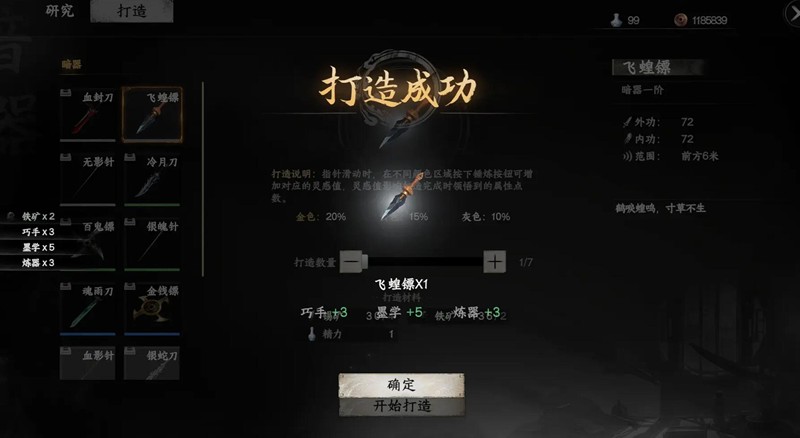 暗器制作流程简单,打开背包点击暗器界面,选择要制作的暗器图纸,消耗对应材料和铜钱即可完成。毒针和袖箭制作成功率100%,无需担心失败。门派任务会逐步解锁高级图纸,比如完成唐门支线任务毒术入门可获得暴雨梨花针图纸。