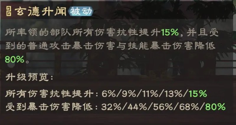 被动技能玄德升闻提供全伤害抗性提升和暴伤降低效果,无论是面对普攻输出队伍还是技能爆发型阵容都能有效应对。王霸之略的联动机制在己方武将释放技能时有概率触发群体治疗,与怒气技能形成治疗闭环,大幅提升队伍生存能力。觉醒后附加的降低敌方怒气积攒速度效果,进一步削弱敌人的技能释放频率。
