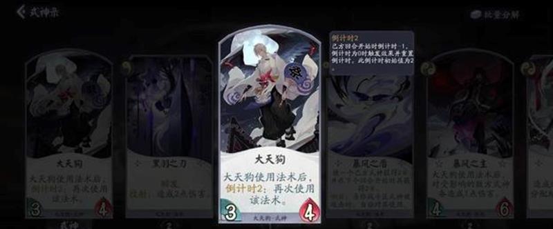 在二勾玉阶段让凤凰火觉醒后,大天狗就可以打出手上的一勾玉牌,每次施放法术都会触发凤凰火的被动,对牌手造成1次伤害。除了凤凰火和大天狗的组合外,还可以搭配雪童子和妖刀姬。雪童子的一勾玉和二勾玉战斗牌都非常实用,妖刀姬则需要携带两张见切来免疫伤害。