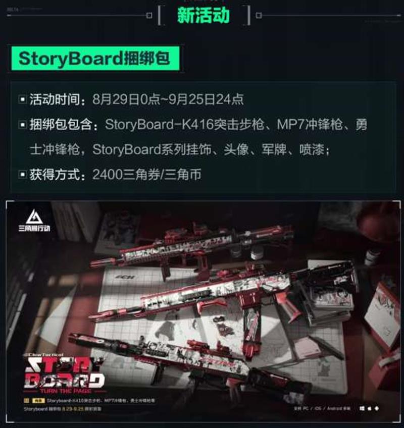 捆绑包包含:StoryBoard-K416突击步枪、MP7冲锋枪、勇士冲锋枪,StoryBoard系列挂饰、头像、军牌、喷漆;