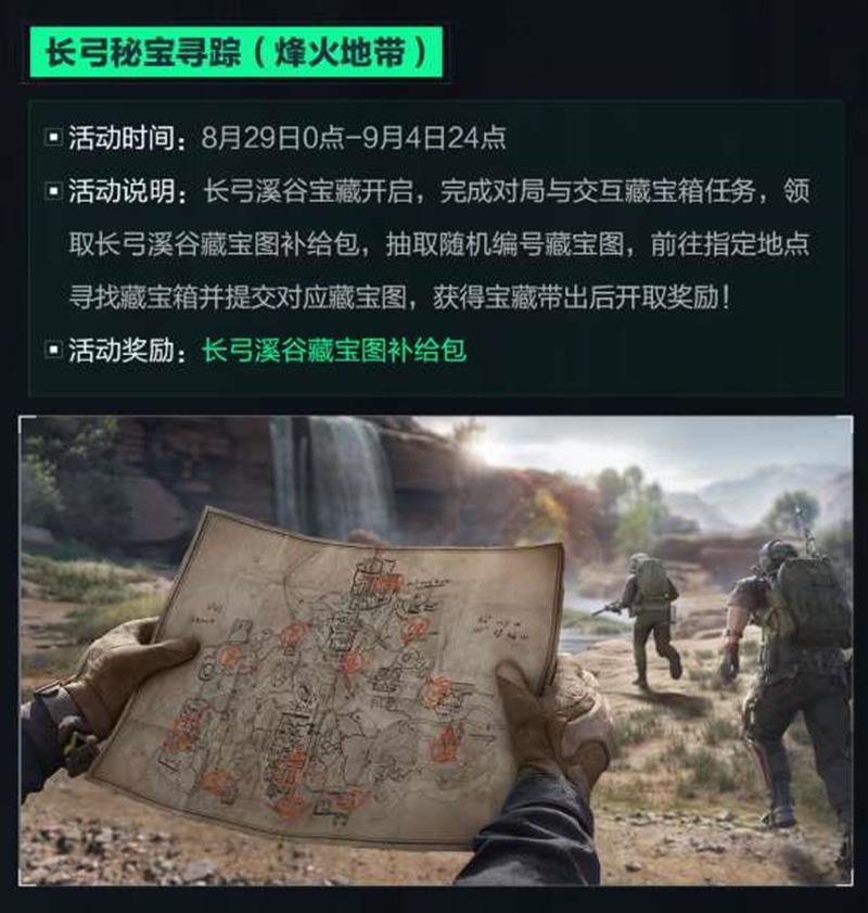 活动说明:长弓溪谷宝藏开启,完成对局与交互藏宝箱任务,领取长弓溪谷藏宝图补给包,抽取随机编号藏宝图,前往指定地点寻找藏宝箱并提交对应藏宝图,获得宝藏带出后开取奖励!