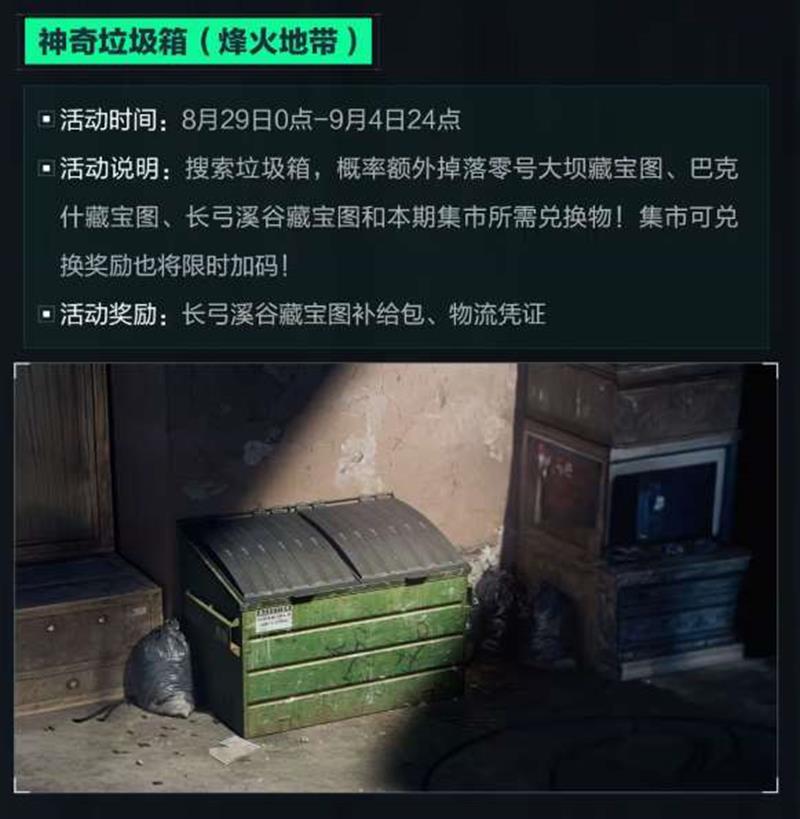 活动说明:搜索垃圾箱,概率额外掉落零号大坝藏宝图、巴克什藏宝图、长弓溪谷藏宝图和本期集市所需兑换物!集市可兑换奖励也将限时加码!