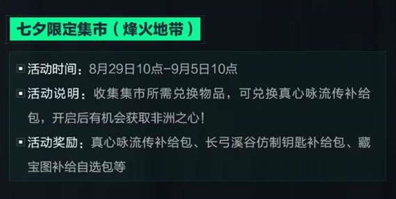 活动说明:收集集市所需兑换物品,可兑换真心咏流传补给包,开启后有机会获取非洲之心!集市可兑换奖励也将限时加码!
