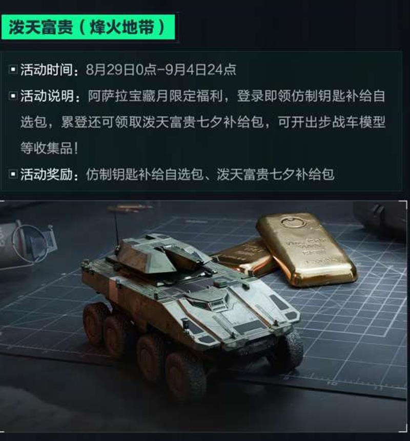 活动说明:阿萨拉宝藏月限定福利,登录即领仿制钥匙补给自选包,累登还可领取泼天富贵七夕补给包,可开出步战车模型等收集品!