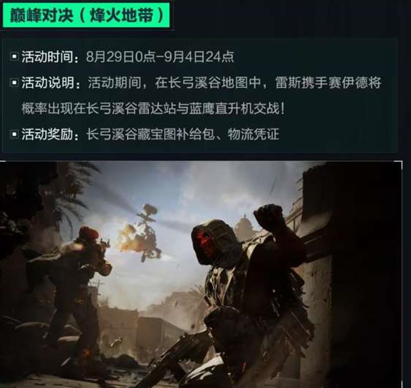 活动说明:活动期间,在长弓溪谷地图中,雷斯携手赛伊德将概率出现在长弓溪谷雷达站与蓝鹰直升机交战!
