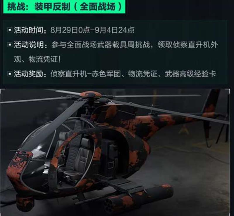 活动说明:参与全面战场武器载具周挑战,领取侦察直升机外观、物流凭证!