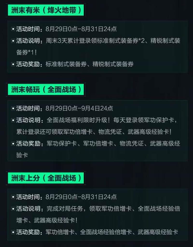 活动奖励:军功倍增卡、全面战场经验倍增卡、武器高级经验卡