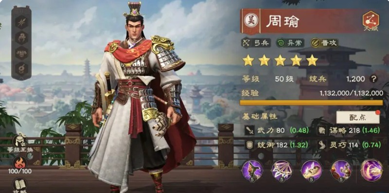 周瑜以控场能力著称,主动技能江火燎天能造成高额伤害并引发持续灼烧效果,东风竞渡技能在副将释放后施加灼烧,普攻带有回血效果,增强了续航能力。觉醒后的周瑜还能降低目标怒气值,进一步提升控制效果。