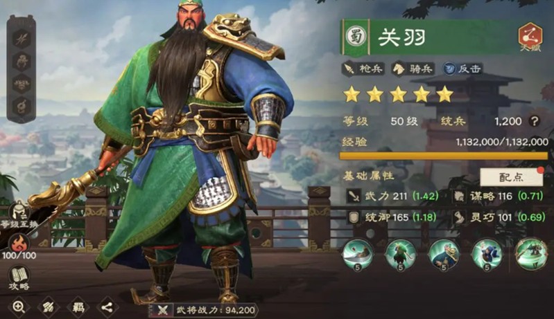 关羽的主动技在旋转收势时能将敌人击退,武力成长极高,使得这一招式伤害远超一般将领。普攻也能汲取天地元气回复怒气,增强后续爆发。被动技能提升了反击触发概率和伤害,适合构建以静制动的反击阵容。