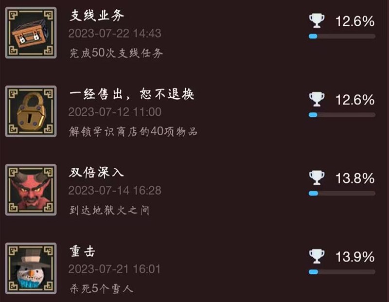 探索成就需要探索地图和互动环境,比如淘金热副本中多逛多杀骷髅能拿到这么多骨头成就。而发现全部村庄获得地理学家成就,打开地图查看未探索区域,逐一前往即可。与特定NPC成为朋友获得友谊长存成就,多次与酒馆老板对话并购买饮品即可达成。在商店购买10件商品获得购物狂成就,初期购买基础装备时即可顺便完成。探索时多与环境互动,点击可疑物体可能触发隐藏成就,比如调查森林中的神秘石碑获得古代知识成就。