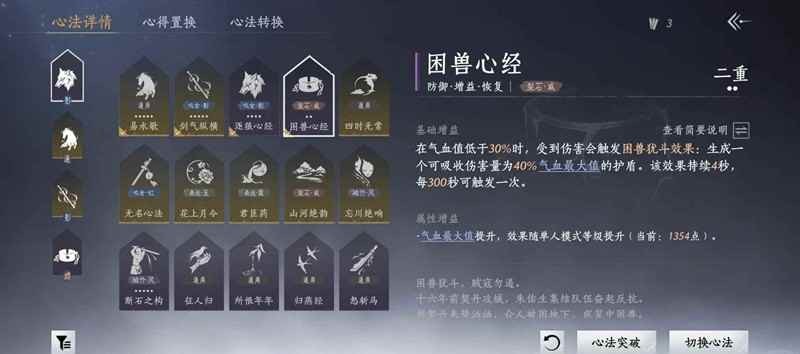 基本配置:抗造困兽这两本心法必带,然后up推荐带山河+长生无相,不带霜天白夜。理由是卸反核心机制都在金心法的后面几重,33完全吃不到,不如放弃可有可无的卸反。山河作为抓机会反杀关键技能也不建议放弃,实在用不熟练的话可换霜天白夜。奇术方面必备解控蛤蟆鹰爪吐火凌云骑龙,剩下两个位置推荐太白点穴