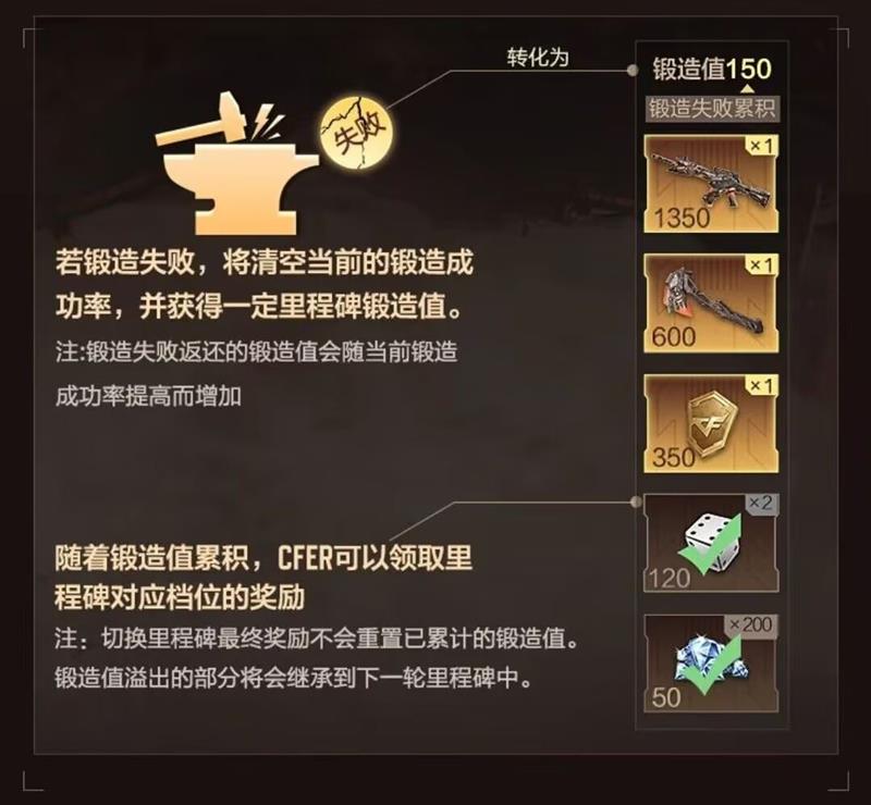 只有成功率达到了100%,才能获取全部锻造奖励。如果成功率达到50%的时候就去锻造,会怎么样呢?当然有50%的几率锻造成功,获取心仪的武器道具与锻造里程碑里的奖励;还有50%的几率锻造失败。