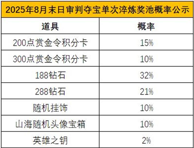 每次淬炼都可以获得一份随机奖励,这些奖励包括赏金令积分卡、钻石、随机挂饰、山海随机头像宝箱、英雄之钥。具体的概率如下: