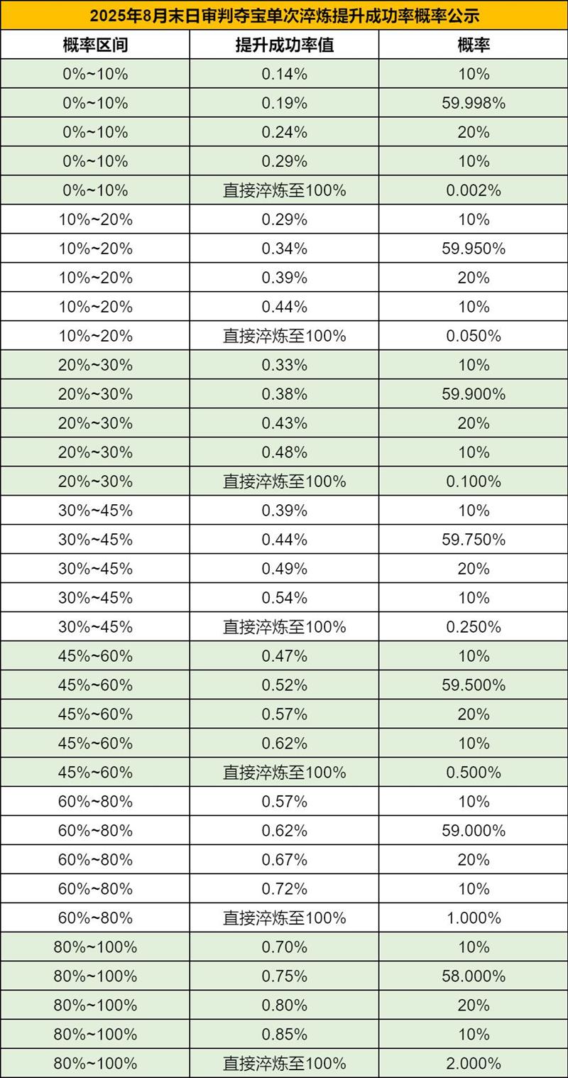 每一次淬炼不仅可以获取随机奖励,最重要的是提高锻造的成功率,为获取大奖做准备。下面是单次淬炼提升成功率的概率: