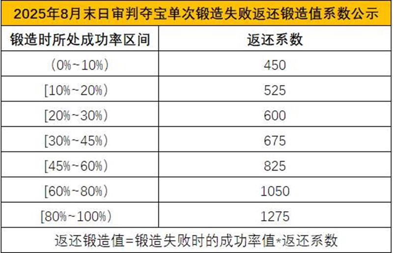 锻造失败则会获取一定的锻造值,返还锻造值=锻造失败时的成功率x返还系数。具体的返还系数如下: