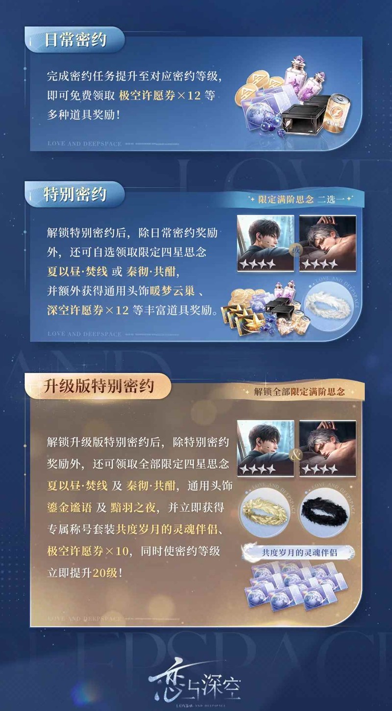 解锁升级版特别密约后,除特别密约奖励外,还可领取全部限定四星思念「夏以昼·焚线」及「秦彻·共酣」、通用头饰「鎏金谧语」及「黯羽之夜」;