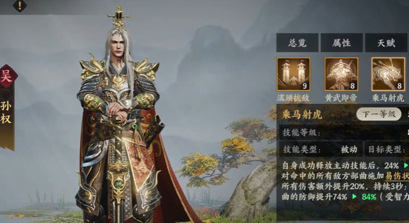 孙权是团队协作型将领的代表,尤其擅长弓兵体系。濡须抗敌的主动技能能覆盖大片战场,命中目标越多越能强化全队技能威力。乘马射虎的被动技能兼具攻防增益,使其在远程战斗中表现突出。与周瑜、吕蒙组成铁三角配置,能形成强大的远程火力网。