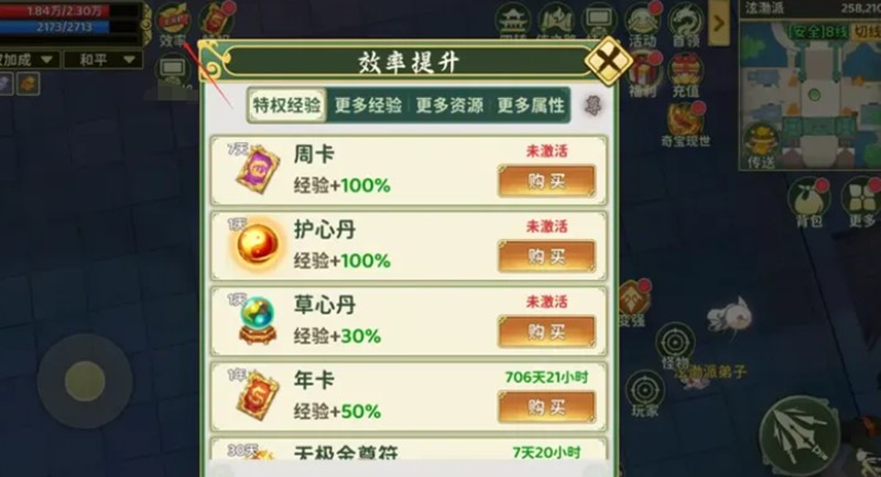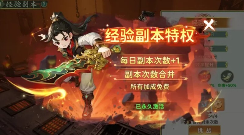 想要提升挂机效率,经验加成体系同样不可忽视。游戏中提供多种buff叠加效果,玩家可以通过血条旁边的图标查看未激活的加成,并及时购买。护心丹、周卡等核心道具可提供100%经验加成,年卡则增加50%。组队时每多一名队友,额外获得10%经验加成,竞争线地图还能获得20%经验提升。启用特权后,经验副本每日挑战次数从三次增加到四次,进一步提升收益。