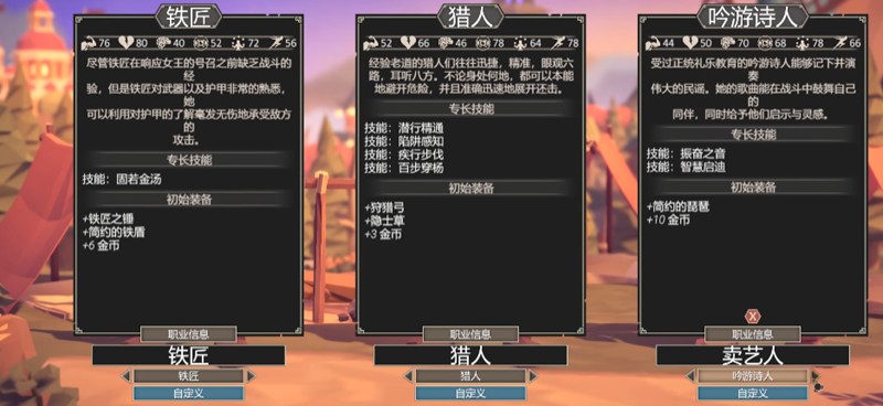 铁匠在为了吾王中扮演着坚实的前排角色,初始装备的重型铠甲让他拥有出色的物理防御能力,同时淬火打击技能可以造成持续伤害。前期优先提升力量属性,解锁破甲一击后能有效应对高护甲敌人。猎人则依靠敏捷身手掌控战场节奏,短弓射击可精准打击敌方后排弱点,探索时的追踪技能有助于发现隐藏宝藏和规避陷阱。如果加入吟游诗人,其幸运光环能提升全队暴击与闪避概率,史诗叙事技能还能为队友补充专注值,增强整体输出能力。