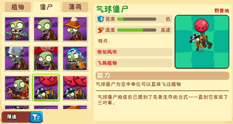 气球僵尸延续了系列经典的空中进攻模式,拥有230点血量和地面26、空中30的双重移速,能够突破传统地面防线,虽然能无视地面攻击,但三叶草引发的飓风可以将其吹离战场,实战中可以用猫尾草专门针对,或者升级仙人掌增强对空火力。
