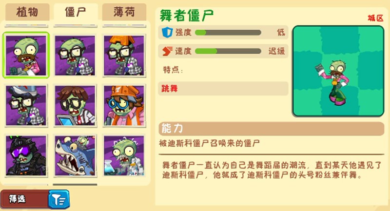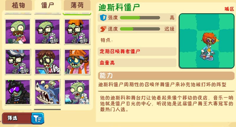 迪斯科僵尸有一定的感染扩散能力,914点血量基础上每10秒召唤4个伴舞僵尸,形成了人海战术,新一代版本缩短的召唤间隔使这一威胁倍增,需尽早部署毁灭菇实施范围打击,或用冰冻生菜打断舞蹈节奏。