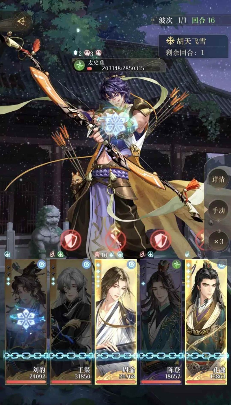 注意控制每3回合一次订单,不要提前完成,开大的计数可以看太史慈血条上方的交叉双兵图标,比如说刘豹开单数大的回合不要周瑜孔融一起开大,这样订单会提前完成乱节奏,也容易错乱,保持3回合一个循环方便自己记忆。