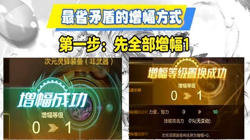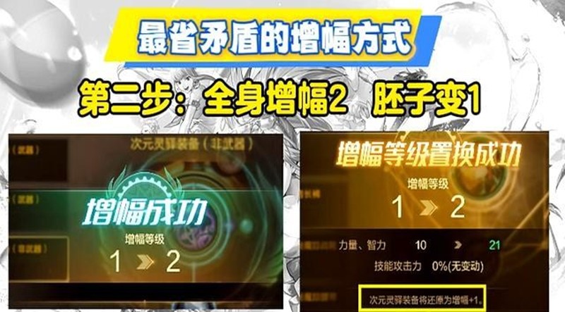 对于资源有限的玩家,可以采用胚子置换法来节省材料。操作方法是先准备一个胚子装备,将其增幅到一级,然后置换给目标装备,胚子等级归零后重新增幅。重复这个过程,直到全身装备都达到增幅一级。接着把胚子增幅到二级,与已经增幅一级的装备置换,目标装备变成二级,胚子回到一级。继续循环操作,最终能让九件装备全部达到四级增幅,胚子停留在三级。