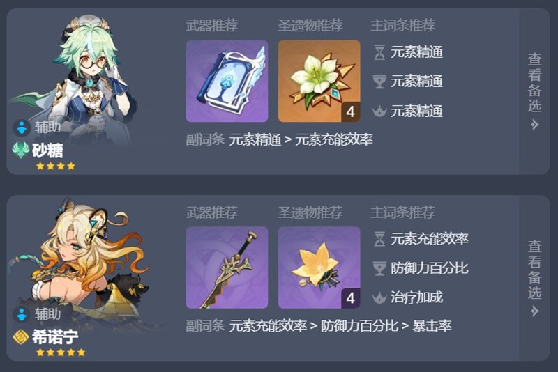 玛拉妮的武器推荐以提升水元素伤害加成为主,圣遗物则优先选择元素精通、水元素伤害加成和暴击伤害等词条。砂糖的武器和圣遗物推荐以元素精通和元素充能效率为核心,确保能够快速提供减抗和精通加成。火神的装备则侧重于攻击力百分比、火元素伤害加成和暴击率,以最大化后台火伤输出。希诺宁的装备推荐以元素充能效率、防御力百分比和治疗加成为主,确保其能够稳定提供增伤和辅助效果。