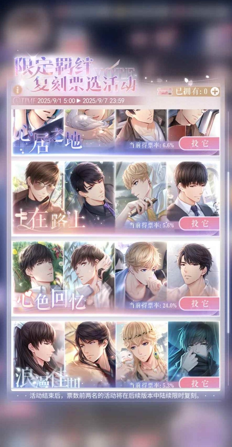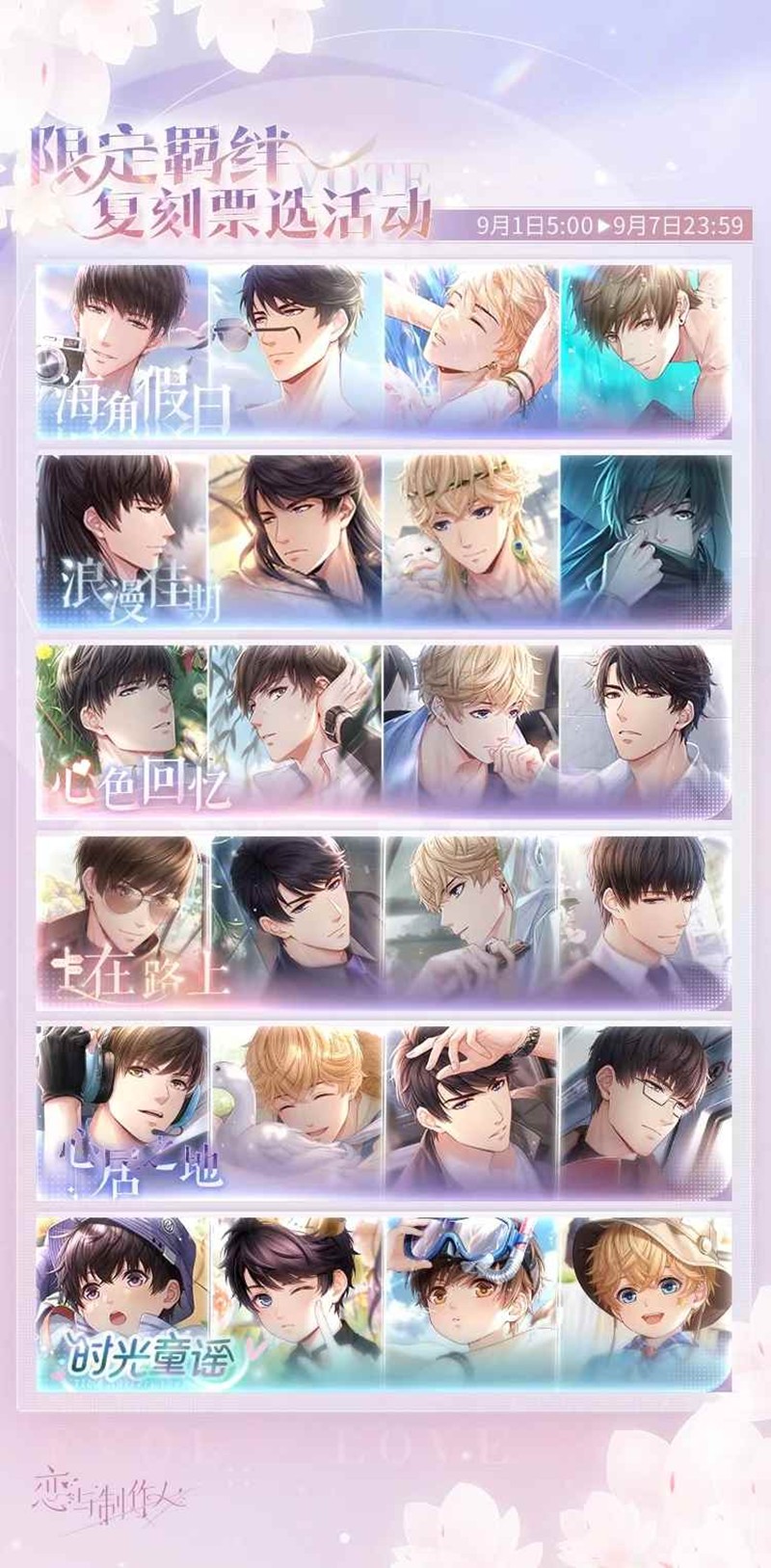 以上就是恋与制作人复刻活动投票今日开启,投票前两名将复刻的全部内容了,更多游戏资讯,攻略内容敬请关注切游网,您的支持是我们努力的动力!
