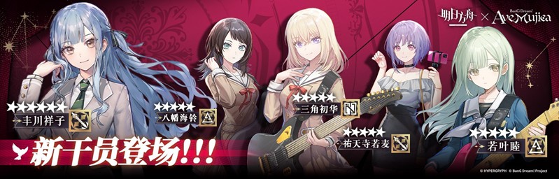 这次联动带来了五位全新干员,他们都是AveMujica乐队的成员。其中,6星近卫丰川祥子和5星辅助三角初华、5星特种若叶睦需要通过限时寻访人偶的歌谣获取。丰川祥子在6星出率中占50%,三角初华和若叶睦在5星出率中各占25%。另外两位干员,4星狙击八幡海铃和4星术士祐天寺若麦可以通过参与活动关卡和兑换商店免费获取,不用花钱抽卡。