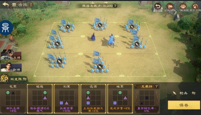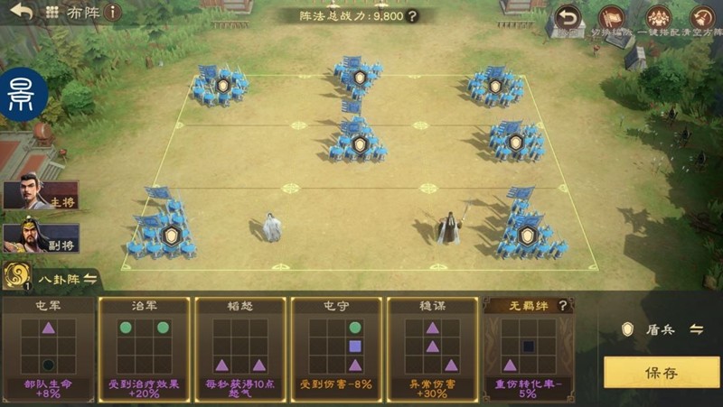 搭配“鞠躬尽瘁”技能,全队的异常伤害都会提高,还能顺带回血。在阵容搭配上,副将可以选择司马懿,两人都是异常流派的角色。训练飞熊军可以提升异常伤害,阵法推荐使用八卦阵,能够让灼烧效果一直存在,拖到后期优势特别明显。