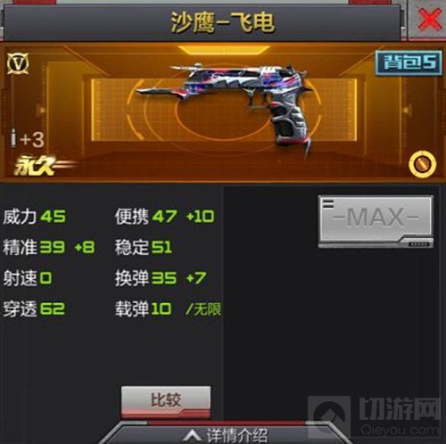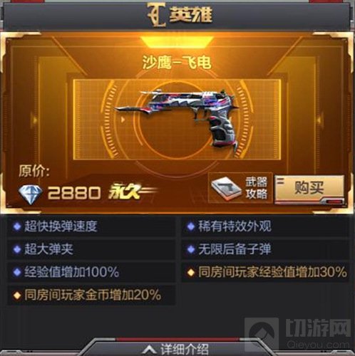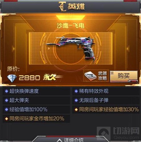 如果你是一个狙击手,那副武器一定少不了,如果你没有充足的钻石将沙鹰-修罗带走,那一定不要忘记沙鹰-飞电。更多CF手游的攻略,请大家继续关注切游网。