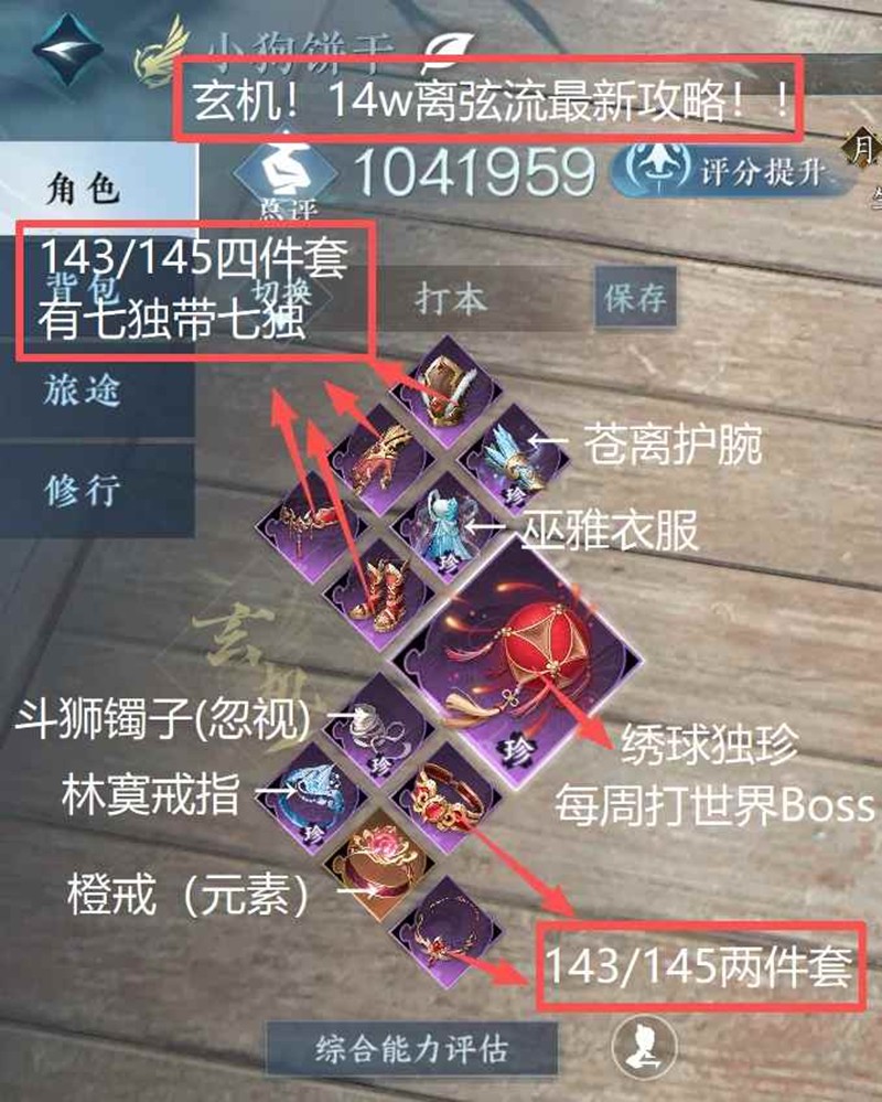 上身装备:苍离护腕(力量)+巫雅衣服(力量)+林寞腰带+白露鞋子+143/145两件套