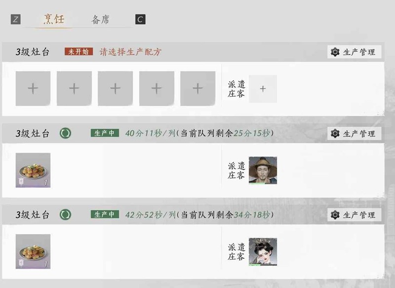 烹饪:两条烹饪线做8级菜,最好选择当日热卖菜品。有溢出可以喂庄客回体力。顺便完成制作320个8级菜品的篇章任务。