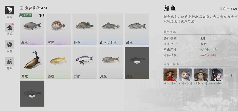 渔获:2个人收集鲤鱼做土豆炒鱼酥/辣炙鲤鱼,顺便完成收集1200个8级渔获土特产的篇章任务。