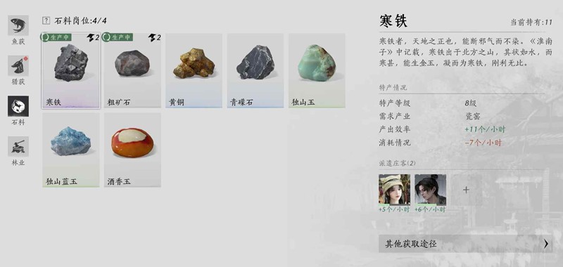 石料:2个人挖寒铁,2个人挖粗矿石,寒铁为8级石料,可以顺便完成收集1200个8级石料土特产的篇章任务。后期材料溢出可减员或停工。
