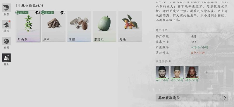 林业:1个人伐木满足酒瓶需求,后期溢出可停工。2个人收集野山参做山参辣茄烩/参炒胡萝卜,顺便完成收集1200个8级林业土特产的篇章目标。