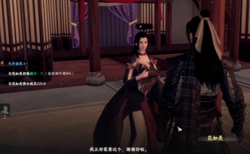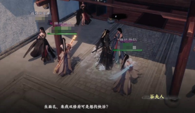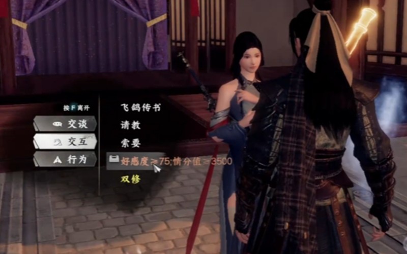 完成上述步骤后玩家返回枰栌城,找到话如是进行对话,此时双修府的加入流程基本完成,玩家正式成为双修府的一员。加入双修府后,玩家可与门派内特定NPC展开互动,当与特定NPC的好感度达到一定数值要求后,再次与该NPC互动时,界面将出现双修选项,点击进入双修状态。