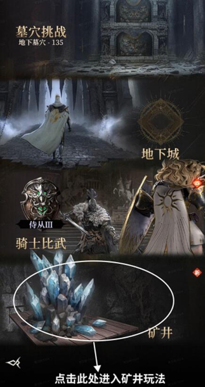 地下城堡4矿井是游戏中重要的资源获取玩法,玩家可以通过开采矿石获得各种珍贵材料。玩家可以通过采矿获得云纹矿石、星晶矿脉等珍贵资源。这些材料不仅能兑换强力装备,还是合成特殊武器如月光剑的必备素材。游戏每天会重置3次采矿机会,不同矿区设有独特的干扰机制,对玩家的操作技巧有一定要求。想要进入矿井,需要先完成第三章“哀嚎山谷”的主线任务,之后在主城左侧会出现矿井入口。在此之前,还需要完成铁匠格雷的支线任务“矿镐修复”,这个任务需要消耗50个铁矿和20个木材。