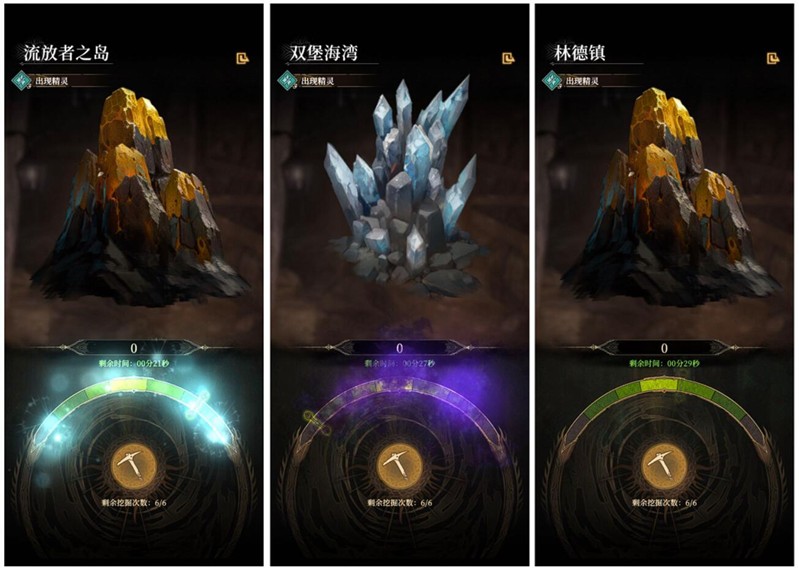 不同矿区会设置不同的干扰机制。流放者之岛会出现随机遮挡视线的精灵,需要专注外圈轨迹。双壁海湾有移动的黑色迷雾,要预判其移动方向。林槌镇的指针会变得半透明,建议保持固定点击节奏。开启震动反馈功能可以帮助判断点击区域,强烈震动表示点中了精准区。玩家可以根据自身操作习惯选择适合的矿区进行挑战,同时注意合理分配每日的采矿次数。