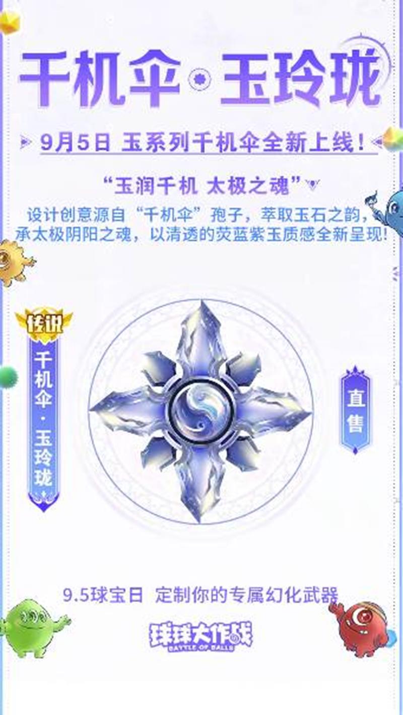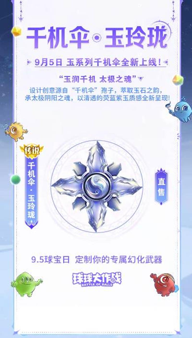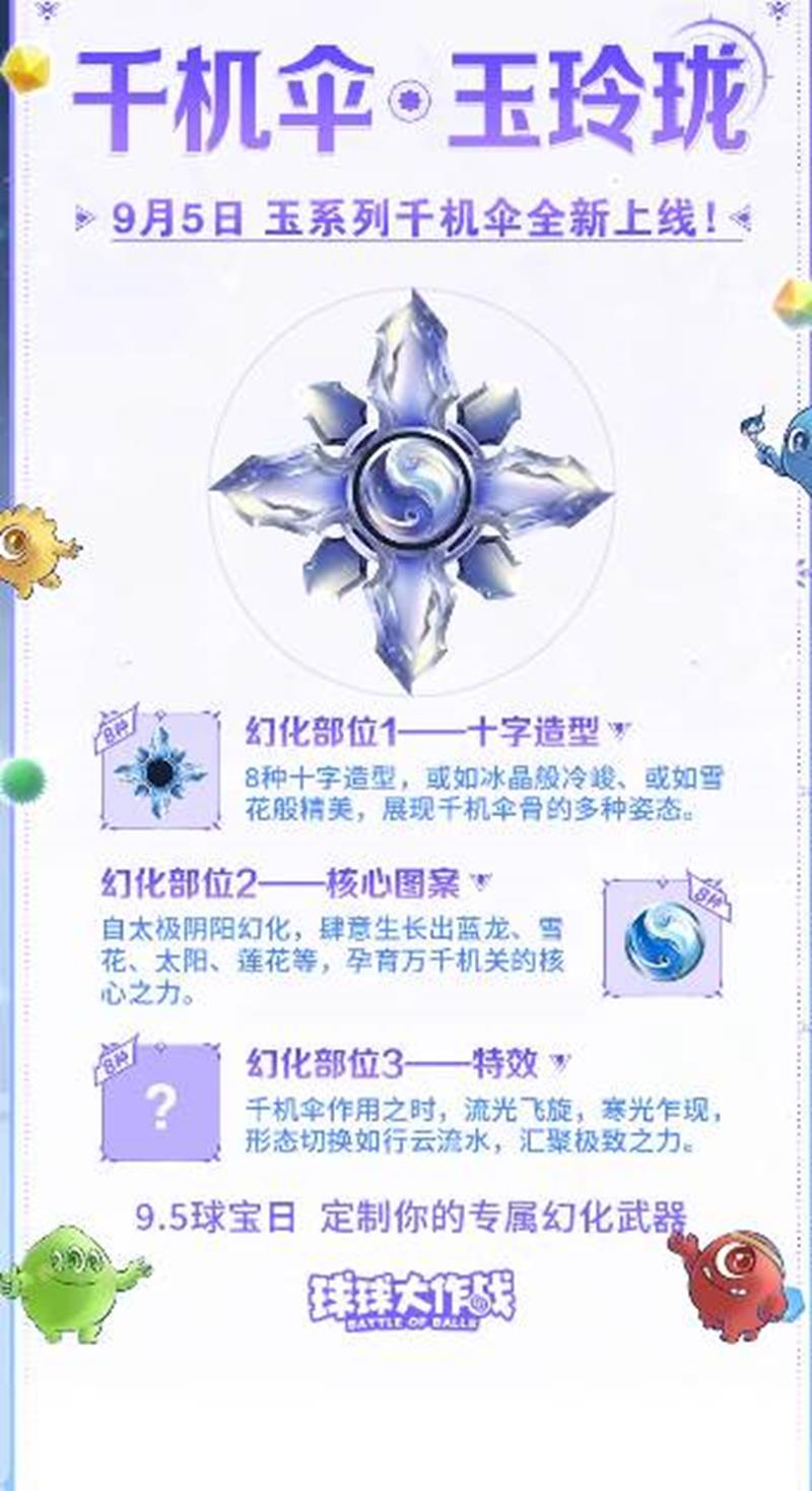 球球大作战将在9月5日带来全新的多形态幻化——千机伞·玉玲珑!这款幻化不仅外观精美,还拥有独特的多形态变换功能,品质拉满,下面我们来一起看看吧~