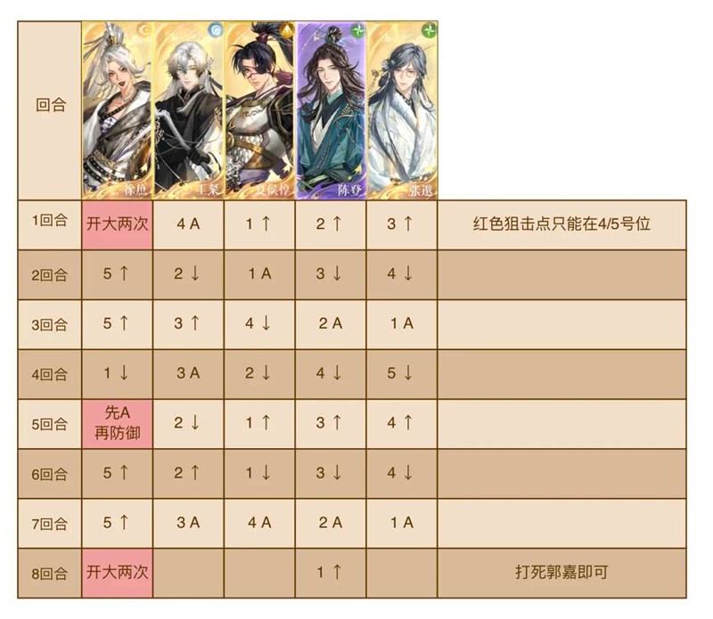 全程打郭嘉。注意第一回合时,红色狙击圈不能落在前三位身上,只能落在后两位陈登/张邈身上,如果在前三位身上就直接退出重开!!!会导致第八回合被贾诩带走
