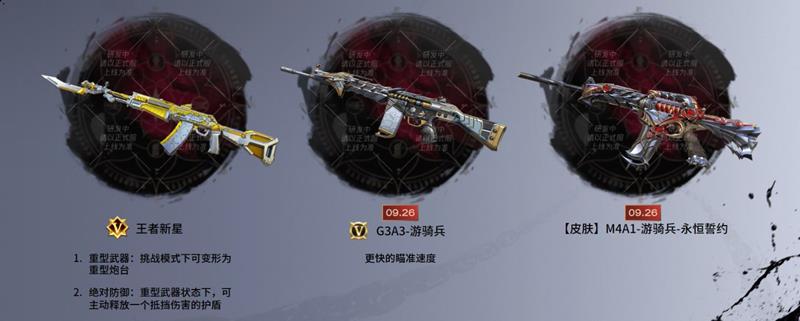 全新王者挑战武器王者新星即将来袭,挑战模式下可变形为重型炮台,期待它在多元化战场的表现。游骑兵家族的新成员G3A3-游骑兵也即将与大家见面,还有全新的游骑兵万化系列,M4A1-游骑兵-永恒誓约等尽数登场!