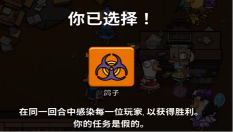 在鹅鸭杀中,鸽子属于中立阵营的一种角色,主要任务是在同一回合内感染所有存活的玩家。只要成功完成这一目标,就能获得胜利。这种角色不需要完成任何任务,只需要通过接触其他玩家来触发感染机制。当所有玩家都被感染后,游戏就会结束,而鸽子则成为最终的胜利者。