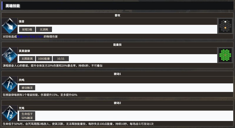 狂想旋律的普通攻击“强音”射程达到3格,虽然伤害不算特别高,但攻击频率较快,适合在战斗初期进行消耗。他的核心技能“英勇旋律”需要消耗1000能量,为全队提供20%的伤害和暴击率加成,持续6秒,这个技能在BOSS战开场时使用效果最佳。被动技能“共鸣”让他在获得增益效果时提升自身伤害,最多可叠加4层,而另一个被动“咒骂”则在生命值低于50%时触发,沉默周围敌人并削减其能量,关键时刻能扭转战局。