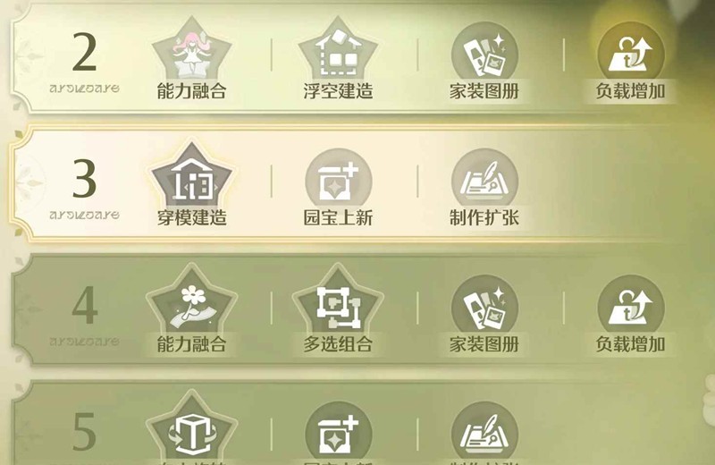 主要收益节点在7级和9级的售价提升5%,以及随等级解锁更多设计图。即使是建筑党也不建议优先升级建造,因为解锁的高级设计图同样需要高级种植/钓鱼/采星/动物素材,先升级建造再回过头来升级其他能力就损失了这期间的额外收益