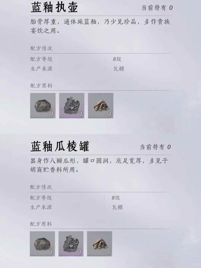 - 烧瓷需求:共需1440个8级酒瓶(对应酿酒需求),单队列每次生产1个酒瓶,队列时间20分钟
