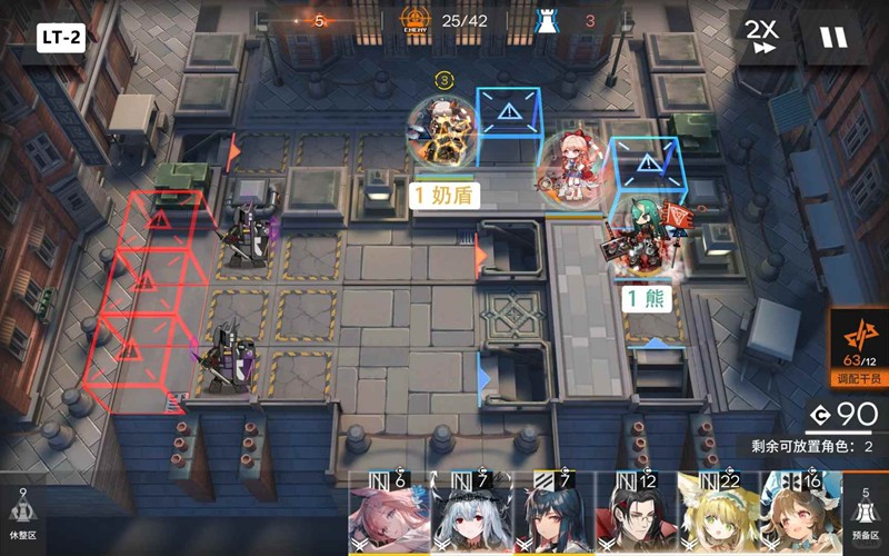 第二关:两个蓝门叠两个重装即可,上面奶盾下面星熊,可以中间加奶或辅助,叠的慢可下投锋。