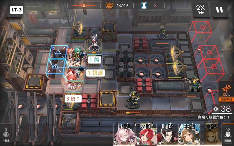 第五关:蓝门前叠一个奶盾,然后右上放星熊,可以加个遥/奶。