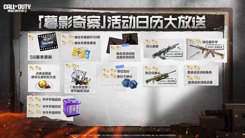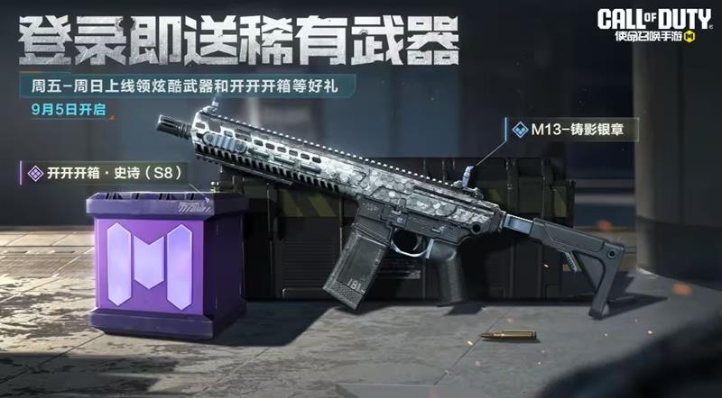 9月5日(本周五),周末登录礼上线。战士们在周末期间登录游戏,即可领取稀有级武器M13-铸影银章、开开开箱和任务卡等好礼,任务卡可用于快速完成福利手册的周任务,助你轻松完成周任务!